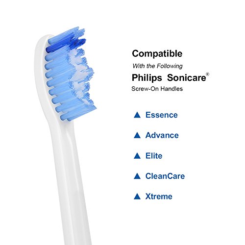 Soniangia is committed to provide high-quality standard replacement Sonicare e-series toothbrush heads for Philips,without the hefty?cost,customer's satisfaction and recognition degree is our pursuit. Why choose Soniangia replacement brush heads? ?Screw-on system:Soniangia e-series brush heads are much easier to remove for cleaning and replacement. ?Round-ended soft Dupont bristles help prevent gum damage and deliver a comfortable brushing experience. ?Soniangia replacement toothbrush heads are strong power to effectively remove plaque and prevents gingivitis! ?Made with ABS engineering plastics,more stable,safety,wearable,durable,not easy broken and looks more luster. ?Blue reminder bristles fade in color to let you know when it's time to replace the brush head.Each toothbrush head come with hygienic travel caps. ?Package List: 4 standard replacement e series brush heads 4 hygienic travel caps ?Fits the following Philips Sonicare E Series electric handles ?Sonicare Advance? ?Sonicare Essence(NOT Compatible with Essence ) ?Sonicare Elite? ?Sonicare CleanCare? ?Sonicare Xtreme? ?The replacement toothbrush heads are compatible with following models HX3300 HX3351 HX3500 HX3551 HX3881 HX4002 HX4101 HX4011 HX4321 HX4772 HX4511 HX4572 HX4573 HX4772 HX4871 HX4872 HX5130 HX5251 HX5300 HX5310 HX5350 HX5351 HX5352 HX5400 HX5451 HX5500 HX5551 HX5581 HX5610 HX5611 HX5751 HX5752 HX5754 HX5810 HX5853 HX5910 HX7351 HX7361 HX7381 HX7551 HX7553 HX7800 HX7841 HX7881 HX9500 HX9552 HX9553 HX9562 HX9842 HX9882 ?Disclaimer:These toothbrush heads are manufactured independently by soniangia.Fits Philips Sonicare all Screw-on electric handles. Take a look above for a full list of compatibility,if you're still unsure,please feel free to use Amazon's customer QA: 0 |
