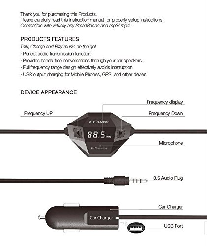 - Title : Ecandy In Car Universal Wireless FM Transmitter with USB Car Charger for Smartphone MP3 Mp4 Audio Player with 3.5mm Audio Jack For iPhone 6 / 6 Plus / 5 / 5S / Samsung Galaxy S5 / S4 / Galaxy Note 4 3 2/ Motorola / Nokia / LG / HTC One and other Enabled Bluetooth
