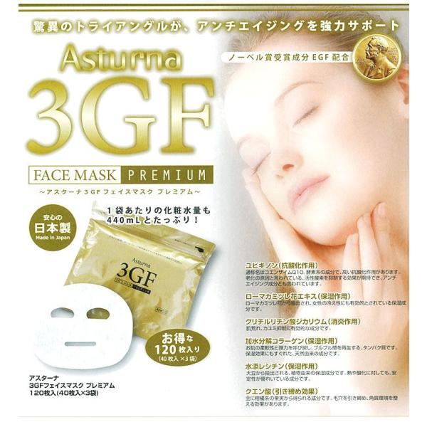 3GFフェイスマスクがリニューアルしました!1袋あたりの化粧水量も440mlとたっぷり!ノーベル賞受賞成分EGF配合≪商品説明≫■商品名:アスターナ 3GF フェイスマスク プレミアム■内容量:120枚入 [40枚入×3袋] ■商品コード:54060058【送料無料】アスターナ 3GFフェイスマスク プレミアム 120枚(40枚入×3P)【EGF/FGF/IGF/フェイスパック/シートマスク/フェイスマスク/日本製/EGF/Asturna 3GF Face Mask
