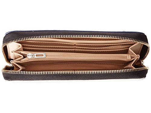 Zip-around closure. Detachable wristlet strap. Exterior features brand hardware at front and zip pocket at back. Fully lined interior features center zip pocket, 12 card slots, and currency slip pockets. Imported.