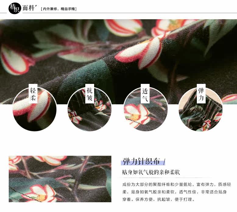 面料质感轻柔,亲肤舒适,贴身穿着轻松无压力。 弹力针织布