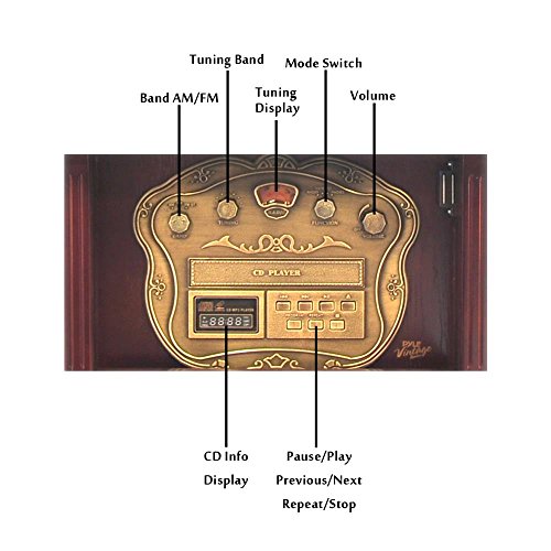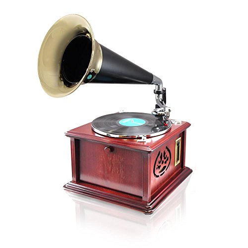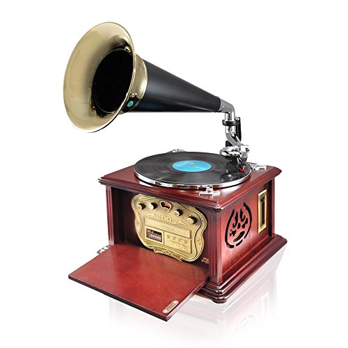 -. Feature : Classic Style Turntable with Modern Technology - Elegant Vintage Replica Crafted Sound System / Functional & Acoustic Enhancing Retro Gramophone Horn - Bluetooth Wireless Audio Streaming / Works with All of Your Favorite Devices (iPhone, Android, Smartphone, iPad, Tablet, Laptop, Computer) / (3) Speed Turntable: 33-1/3, 45, and 78 RPM - AM/FM Radio - Aux (3.5mm) Input - USB Flash Reader / CD Player - Cassette Player - RCA (L/R) Output - Vinyl-to-MP3 Recording: Record to Your USB Flash Drive