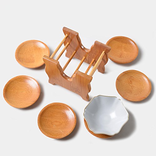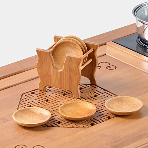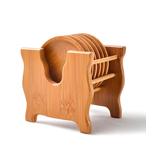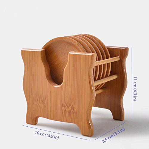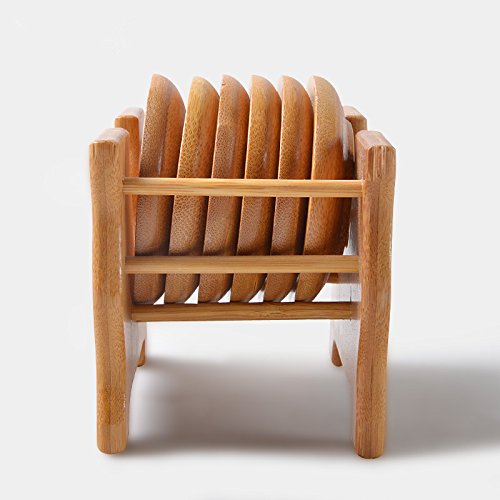(6 Piece Set + Rack) 6 Bamboo Bamboo Drink Coasters Wooden Trivets Place Mats Burner Pads Tray for Mug Cups Hot Dishes Plates Pan Pot Kitchen Counter-top