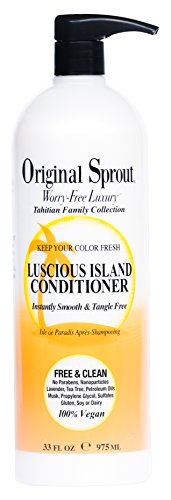 ORIGINAL SPROUT LUSCIOUS ISLAND CONDITIONER: Enjoy our new, ultra rich conditioner that instantly transforms the most dry, damaged hair into silky, soft healthy locks; with tropical Mongongo Oil known for its healing, regenerative powers and vegan jojoba protein to rebuild and strengthen. Hair color stays fresh with our color keeping pH of 4.5-5.5. Our must have conditioner smells naturally delicious inspired by tropical breezes of an island escape. Enjoy your daily escape with Original Sprout! A must have for all hair types. FEATURES: Lice & Insects don't like Organic Rosemary but We Love It! Free of Phytoestrogens Lavender & Tea Tree, Phthalates, Clove & Musk No Soy, Gluten, Honey, Peanut or Dairy No Nanoparticles or Titanium Dioxide 100% Vegan CHILD CONDITIONER: Original Sprout's Conditioner is perfect for babies. This baby conditioner has a plant-based, no tears formula and uses an all-natural blend of herbs and vegan ingredients that help delicate baby hair stay smooth and shiny. ADULT CONDITIONER: Original Sprout's Conditioner is also a perfect choice for adults with fine and delicate hair. This vegan hair conditioner is infused with essential oils and daily vitamins so hair is tangle-free and soft. Most popular option for those seeking: Vegan Conditioner, Gluten-Free Dandruff Conditioner, Detangler Conditioner, Hair Thickening Conditioner, Hydrating Conditioner, Strengthening Conditioner.Feature