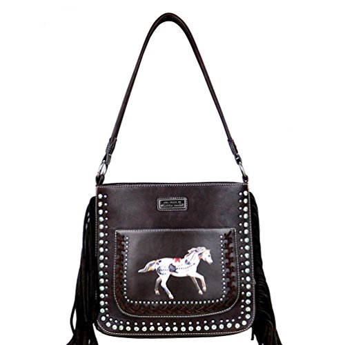 -. Feature : Size: 12" X 4" X 10.75" / Made of PU leather, this hobo bag has:-, The Trail Of Painted Ponies " Gift From The Sky" print on the front slide pocket, Accented with antique,patina studs and leather stitch, Leather fringe on the sides, A zipper enclosure for the entire purse, / Inside single compartment divided by a medium zippered pocket, Inside of bag include a zippered pocket and 2 open pockets, A zippered pocket on the back to conceal the handgun (9 x 5.5), An open pocket on the back, Single flat strap 12" X 4" X 10.75 / Montana West is one of the fastest-rising names in the fashion world, and we carry all their latest products at competitive prices. You can turn to us for handbags, wallets, flip-flops, and other accessories from this up-coming western brand.