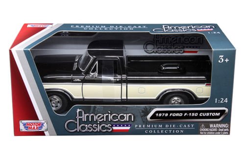 -. Binding : Toy -. Brand : Motor Max -. EAN : 0736983529060 -. Feature : Motor Max American Classis / Licenses By Motor Max / Scale: 1:24 DieCast Metal With Some Plastic Parts / Rubber Tires & Detailed Interior / Brand New Box -. IsAdultProduct : 0 -. Label : Motor Max -. Manufacturer : Motor Max -. ProductGroup : Toy -. ProductTypeName : TOYS_AND_GAMES -. Publisher : Motor Max -. Studio : Motor Max -. Title : New 1:24 W/B AMERICAN CLASSICS COLLECTION - BLACK WITH CREAM 1979 FORD F-150 CUSTOM 2-TONE Diecast Model Car By MOTOR MAX -. UPC : 736983529060