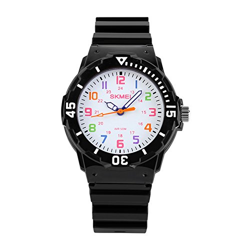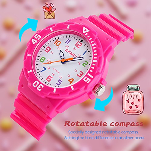 Rotatable Dial: one is for normal time display, the other is for setting time difference in another time zone. The dial outside is rotatable. Colorful Arab numbers and two time display modes help children to learn both time and colors