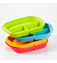 • Brightly colored silicone plates are stackable and portable (set of 1 red and 1 green)