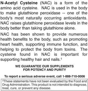 -. Binding : Health and Beauty -. Brand : Natural Nutraceuticals -. Feature : PROMOTES HEART HEALTH - N-Acetyl Cysteine (NAC) supplements fuel production of the natural antioxidant glutathione peroxidase in your body. Improves immune function while strengthening nails and hair. / CERTIFIED POTENCY- Proudly made in the USA in a Good Manufacturing Practices (GMP) certified environmentally friendly facility also certified by the FDA (Food and Drug Administration). / TRY RISK-FREE FOR 30 DAYS - Our supplements come with a no questions asked money back guarantee. If you're not happy with the quality of your supplements, return your purchase for a 100% refund. / BPA-FREE GLASS BOTTLES - We seal your supplements in environmentally friendly amber glass bottles enclosed in heat-resistant sleeves. Each bottle contains 60 gluten-free NAC tablets. / TRUSTED BY AMAZON SHOPPERS - Natural Nutra has a 99%+ positive feedback rating because of our commitment to total customer satisfaction. If anything in your order is wrong, we'll make it right. -. IsAdultProduct : 0 -. Label : Natural Nutraceuticals -. LegalDisclaimer : These statements have not been evaluated by the food and drug administration. This product is not intended to diagnose, treat, cure, or prevent any disease. -. Manufacturer : Natural Nutraceuticals -. MPN : 0743006000 -. PackageQuantity : 1 -. PartNumber : 0743006000 -. ProductGroup : Health and Beauty -. ProductTypeName : HEALTH_PERSONAL_CARE -. Publisher : Natural Nutraceuticals -. Studio : Natural Nutraceuticals -. Title : Natural Nutra N,Acetyl L,Cysteine (NAC) Amino Acid Supplement, 600 mg, 60 Capsules