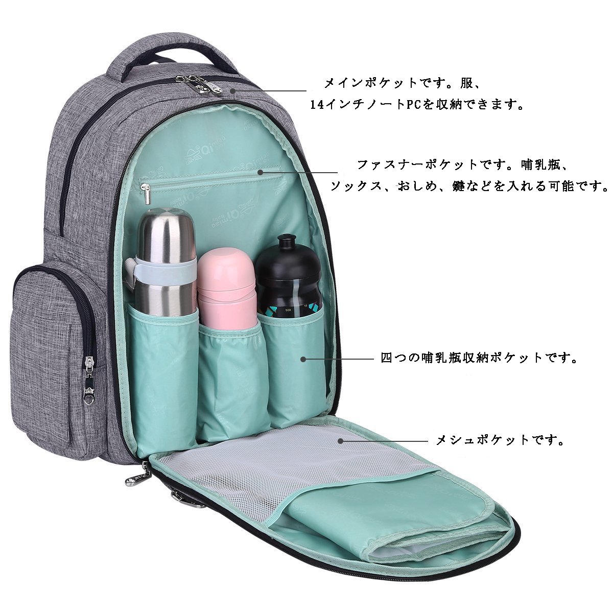 This pocket has a baby bottle storage pocket, mesh pocket, zip pocket.