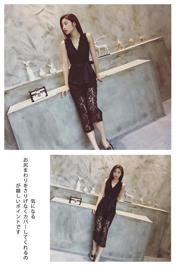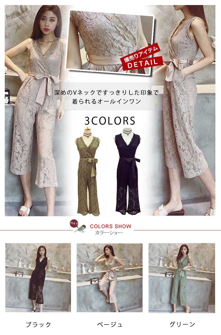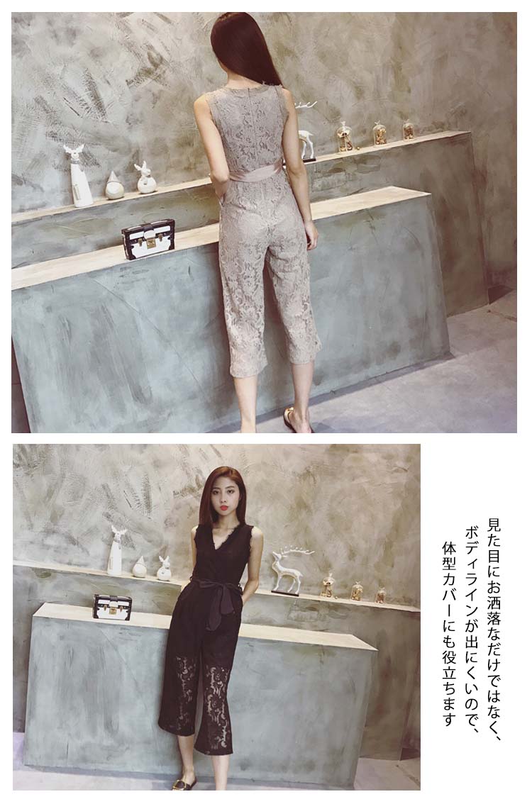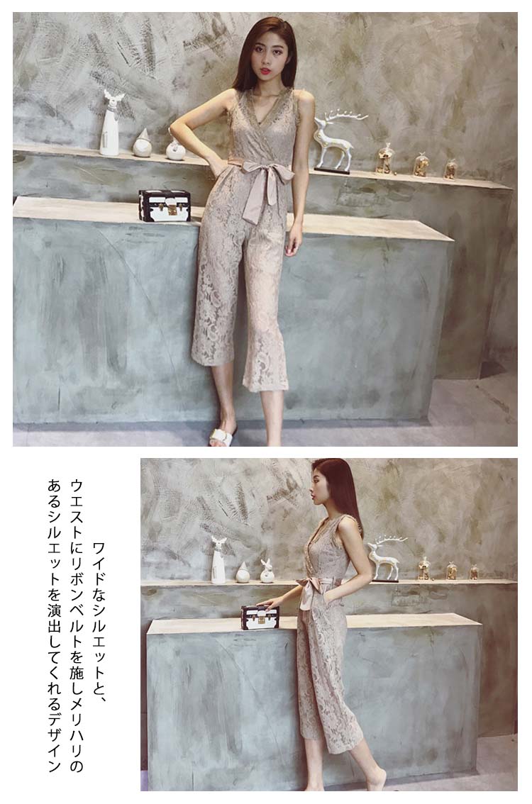 | 深めのVネックですっきりした印象で着られるオールインワンワイドなシルエットと、ウエストにリボンベルトを施しメリハリのあるシルエットを演出してくれるデザイン 見た目にお洒落なだけではなく、ボディラインが出にくいので、体型カバーにも役立ちます気になるお尻まわりをさりげなくカバーしてくれるのが嬉しいポイントです | |