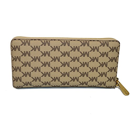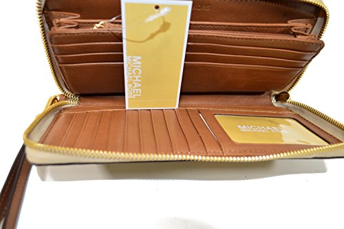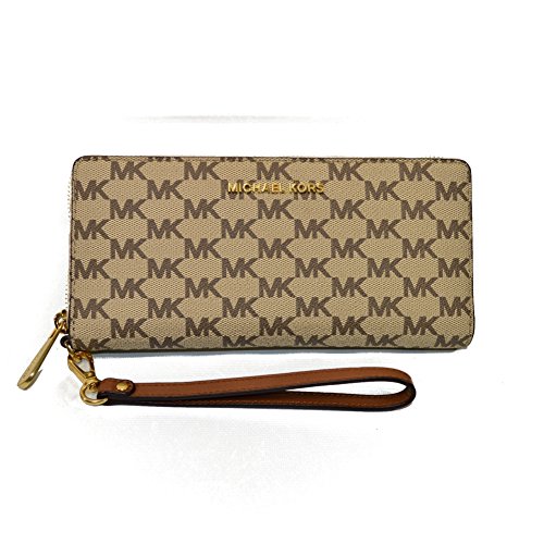 Binding : Apparel Product Description Michael Kors Jet Set Travel wallet is crafted in monogram printed PVC coated canvas with leather trim and polished hardware. It is accented with Michael Kors logo across the front. This spacious zip around style wallet has a leather and signature fabric interior that features (16) card slots, a clear ID slot, multiple full length bill compartments and a zippered coin compartment. It has a removable leather wristlet strap with a drop of about 5". It is larger than many and measures approximately 8.25" (L) x 4" (H) x 1.25" (W) and has an MSRP of $168.00. 0