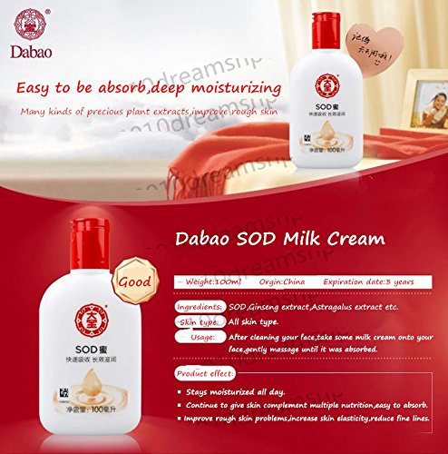 -. Binding : Misc. -. Brand : DaBao -. EAN : 0634304747875 -. Feature : Dabao SOD Milk Cream Moisturized All Day Easy to Absorb Natural Herb Extract Moisturizing 100ml Improve Rough Skin Whitening / Easy to be absorb,deep moisturizing / Many kinds of precious plant extracts,improve rough skin / Ingredient:SOD,Ginseng extract,Astragalus extract etc. Weight:100ml Orgin:China Expiration date:3 years Usage: After cleaning your face, take some honey onto your face, gently massage until it was absorbed. Because different people has different skin, please stop use if any discomfort occurs. Product effect: Stays moisturized all day. Continue to give skin complement multiple nutrition,easy to absorb. Improve rough skin problems,increase skin elasticity,reduce fine lines. / Dabao SOD milk cream contain SOD, adding ginseng extract,astragalus extract etc natural plant liquid and moistening skin care ingredient, constantly to replenish nutrition to your skin, easy to be absorb, and develop a protective coating on your skin surface, prevent skin moisture loss for long time. Dabao SOD milk cream with moisture for long time, keep your skin moisture. Use it often, could help improve the coarse problem of your skin, enhance your skin elasticity, and reduce wrinkles. It is suitable for your whole family and four seasons. -. ProductGroup : Beauty -. ProductTypeName : BEAUTY -. Title : Dabao SOD Milk Cream Moisturized All Day Easy to Absorb Natural Herb Extract Moisturizing 100ml Improve Rough Skin Whitening -. UPC : 634304747875