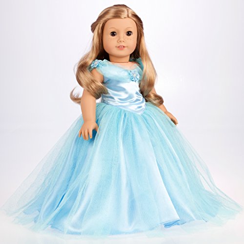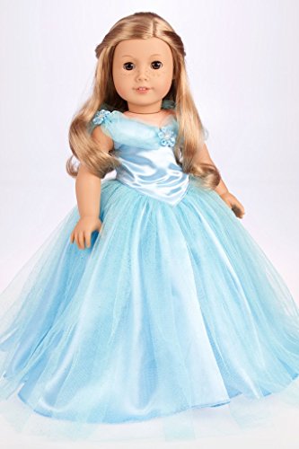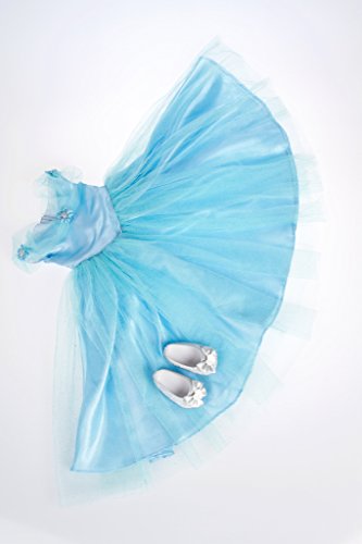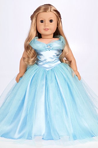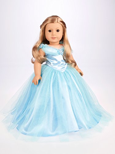 She is ready now for a ball of her lifetime. This magnificent gown is made of light blue satin and sparkling tulle. The skirt is wide huge and light as air. It is matched with silver slippers.