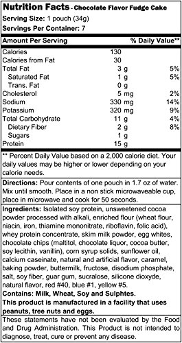 Product Description Quick, easy, moist YUMMY! You'll want to have cake every day and with only 130 calories, now you can. ProtiDiet Chocolate Fudge Cake is a lower calorie, high protein dessert with only 3 grams of fat. 0
