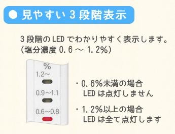 | 塩分摂取量に気をつけたい方、減塩をサポートしている方におすすめします。0.6%~1.2%の塩分濃度を3段階のLEDで表示します。60度~80度の範囲で測定できます。 |