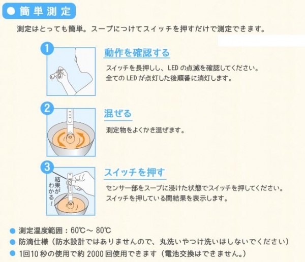塩分摂取量に気をつけたい方、減塩をサポートしている方におすすめします。0.6%~1.2%の塩分濃度を3段階のLEDで表示します。60度~80度の範囲で測定できます。 |
