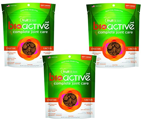 -. Feature : 3 Pack of Fruitables BioActive Complete Joint Care Functional Chewy Treats, 6 oz Each / Made in the USA / Salmon oil and flaxseeds, rich in DHA & EPA (omega 3), support normal inflammation level, which is often present with joint issues and pain / Each treat contains 300 mg of glucosamine and 50 mg of chondroitin / Free of grains, gluten, corn and soy