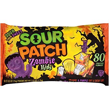 -. Binding : Misc. -. Brand : Sour Patch -. EAN : 0070462000023 -. Feature : Sour Patch Kids - First they're sour. Then they're sweet. Limited time Halloween Edition / Sour Patch Kids are a fun, soft, and chewy candy for children and adults. / Enjoy this extreme flavor wrapped up in a sour-then-sweet gummy candy. / Perfect for parties or a trick-or-treat snack. / This package contains one large bag of Fun Sized Sour Patch Kids Candy. For a total of 80 .5 oz packs -. IsAdultProduct : 0 -. Label : Sour Patch Kids -. Manufacturer : Sour Patch Kids -. PackageQuantity : 80 -. ProductGroup : Grocery -. ProductTypeName : GROCERY -. Publisher : Sour Patch Kids -. Studio : Sour Patch Kids -. Title : Sour Patch Kids Zombies Sweet and Sour Gummy Halloween Candy 80 Fun Sized Packs -. UPC : 070462000023
