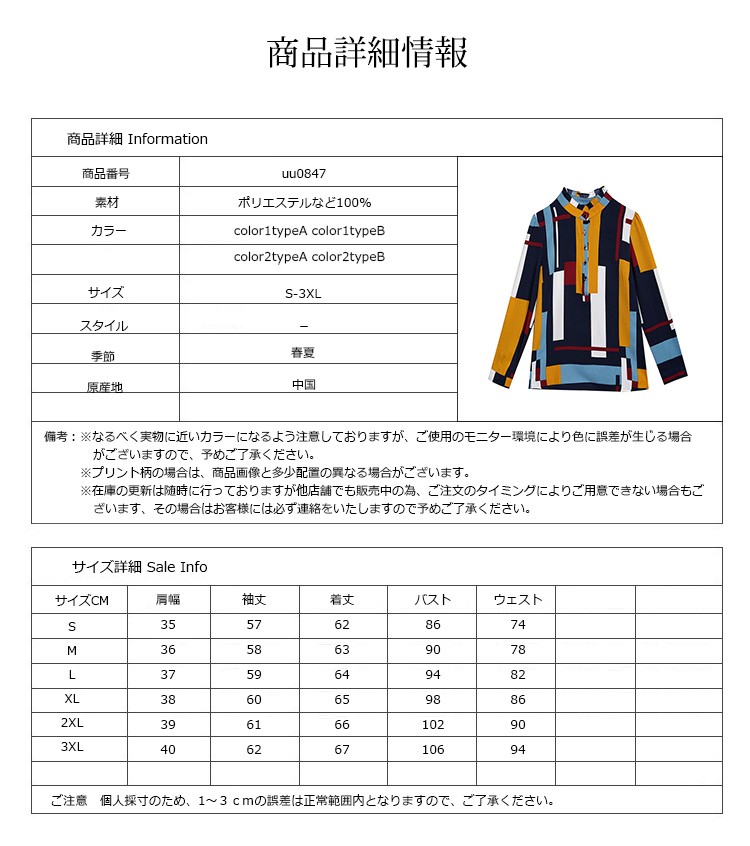 ■素材:ポリエステルなど100%■カラー:color1typeA color1typeB color2typeA color2typeB■サイズ:S袖丈57着丈62バスト86肩幅35ウェスト74M袖丈58着丈63バスト90肩幅36ウェスト78L袖丈59着丈64バスト94肩幅37ウェスト82XL袖丈60着丈65バスト98肩幅38ウェスト862XL袖丈61着丈66バスト102肩幅39ウェスト903XL袖丈62着丈67バスト106肩幅40ウェスト94■原産地:中国