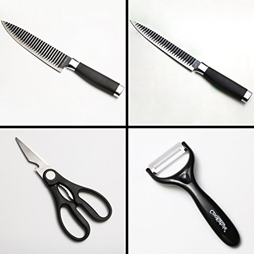 - WHAT YOU GET: 4 Pieces Kitchen Knives, 1 Piece Scissor And 1 Piece Fruit Peeler which Made of 430 Premium Coated Stainless Steel with TRP Resin. Food Grade Material, No Harm to Your Body At All, You Just Feel Free to Use them Now