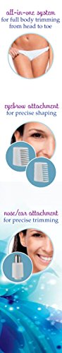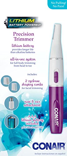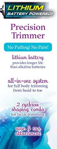 Feature : Lithium ion battery for long-lasting power (included); cordless / battery operated trimmer / Wide blade for precise full body trimming / 2 eyebrow combs for precise shaping / Includes nose and ear attachment