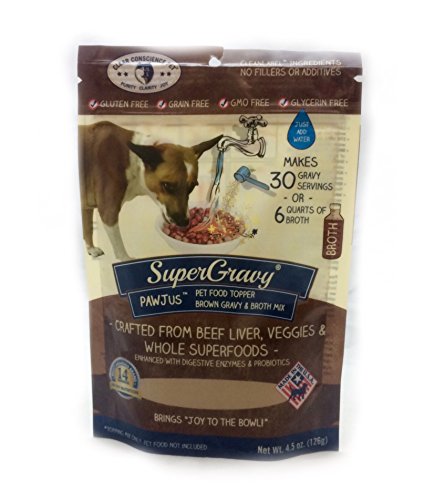 -. Feature : SuperGravy PAW Jus is a savory brown food topper with beef liver and veggies for dogs / Just add water to instantly turn any dog food into a deliciously moist, hydrated meal / Artisan crafted from whole foods for the health of your dog. Enhanced with digestive enzymes and probiotics. No fillers or additives. Gluten free, grain free, GMO free, and glycerin free / Proudly made in the USA | Clear Conscience Pet is the most awarded brand in Pet Nutrition History / 4.5 oz. pouch | Makes 30 gravy servings or 6 quarts of broth
