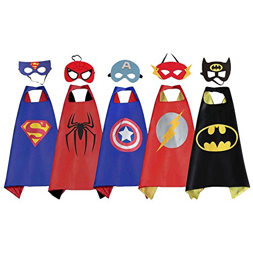 -. Feature : EVERY SUPERHERO NEEDS A SUPER COSTUME : When life calls for a hero, do it in style with this superhero cape and mask set. Whether it's trick-or-treating, play-pretend dates or pajama party, every superhero kid needs a superhero costume to save the world! / HIGH QUALITY FABRIC : Your superkid deserves only the best fabric for his super costume. Each cape is made of finest quality, breathable and durable double-sided satin with easy velcro neck closure. Masks are made from soft felt with comfortable elastic strap so your kids can save the world comfortably in their alter-ego costumes. / GREAT GIFT FOR ALL OCCASIONS : Perfect gift for all occasions, such as birthday party, dress-up occasions, photo shoot, cosplay costume and wonderful treat for Halloween. This superhero costume is also fun way to reward children for good deeds, better than a candy goody bag! / DIY COSPLAY AT HOME WITH THE KIDS : Perfect for costume parties, plays, games of dress up, Halloween or just everyday acts of bravery. This set includes 5 double layered capes ( 27" length x 27" width ) and 5 masks with elastic strap. One size fits for children 3-10 years old. / BECAUSE THEY ARE ONLY KIDS ONCE : Celebrate a super kid when you give them this fun superhero costume set! With 5 superhero personas to choose from, that's 5 times the fun of playing dress-up and discovering his or her own secret powers.