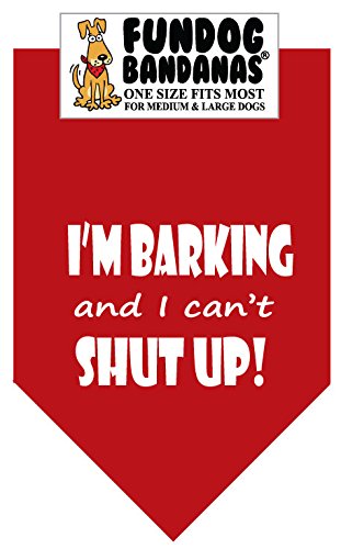 -. Binding : Misc. -. Brand : FunDog Bandanas -. Color : Red -. EAN : 0083351937799 -. Feature : Cute! / Fun! / Affordable! / Makes a great gift! / 22x22x31inches -. Label : The Dog Perk Corporation -. Manufacturer : The Dog Perk Corporation -. PackageQuantity : 1 -. ProductGroup : Pet Products -. ProductTypeName : PET_SUPPLIES -. Publisher : The Dog Perk Corporation -. Size : One size fits most for medium to large dogs -. Studio : The Dog Perk Corporation -. Title : BANDANA - I'm Barking and I can't Shut Up! for Medium to Large Dogs - red -. UPC : 083351937799