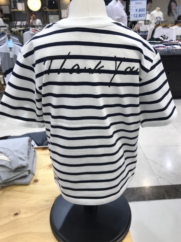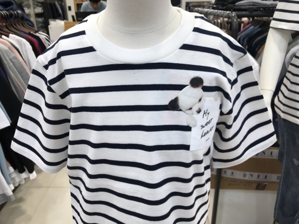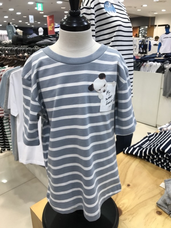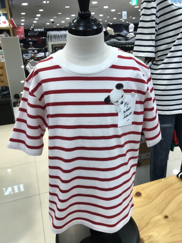 왼쪽가슴에 사랑스러운 강아지 그래픽과 흘림체 레터링으로 포인트를 준 스트라이프 티셔츠 아동사이즈 표기: 2~3세(XS) 5~6세(S) 8~9세(M) 11~12세(L)