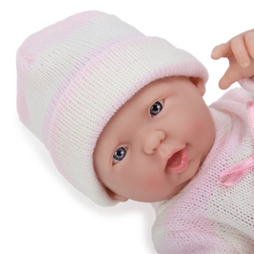 - Feature : Mini La Newborn in white pink stripped knit one size / 9.5" all vinyl / Perfect for all children 2 and above / Made in Spain / Perfect for anyone ages 2 and above