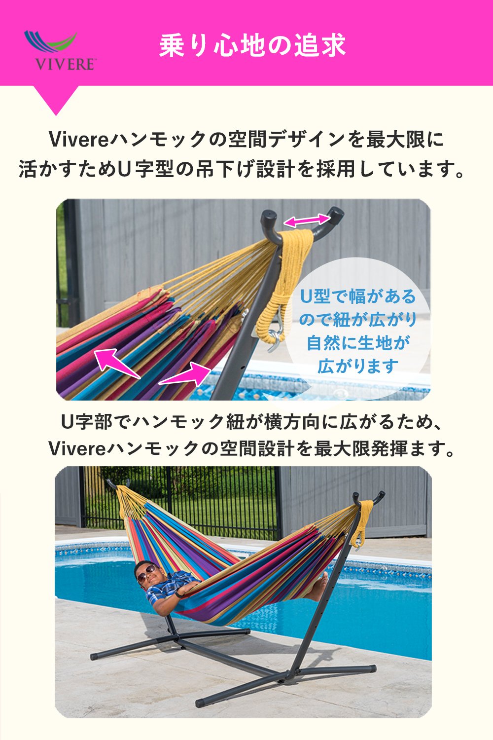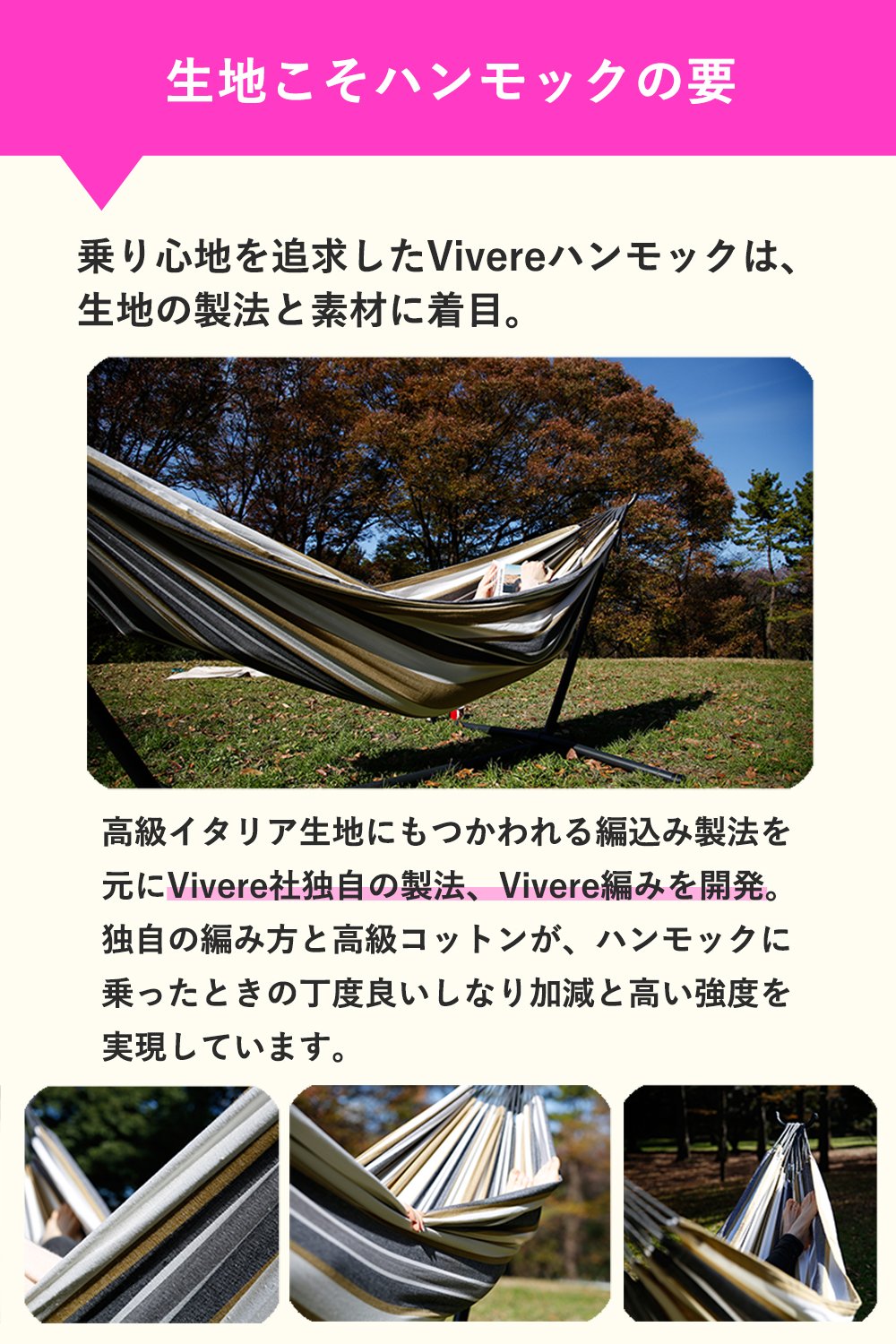 ✅【 生地こそハンモックの要 】Vivereハンモックは生地が乗り心地に影響を与えると考え、その製法と素材に着目。高級イタリア生地にも使われる「編込み製法」を元に、Vivere社独自の製法、「Vivere編み」を開発し、素材にも高級コットンを使用。Vivere編みと高級コットンがハンモックに乗った時の絶妙な肌触りと伸縮性、高い強度を実現しています。