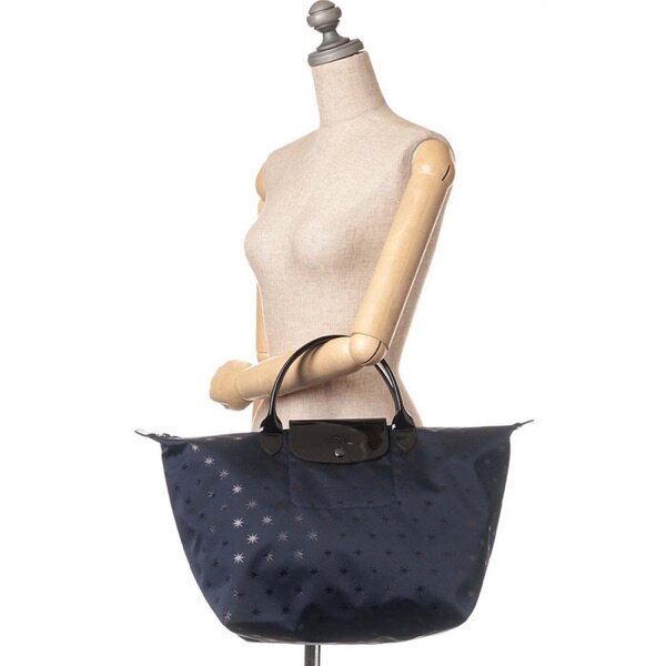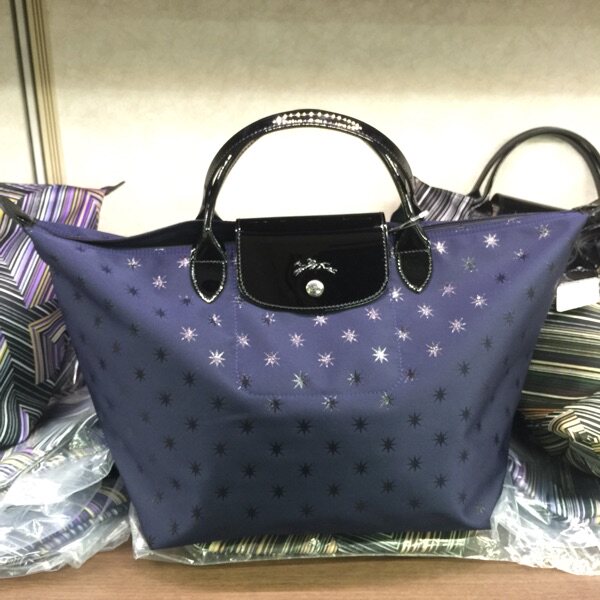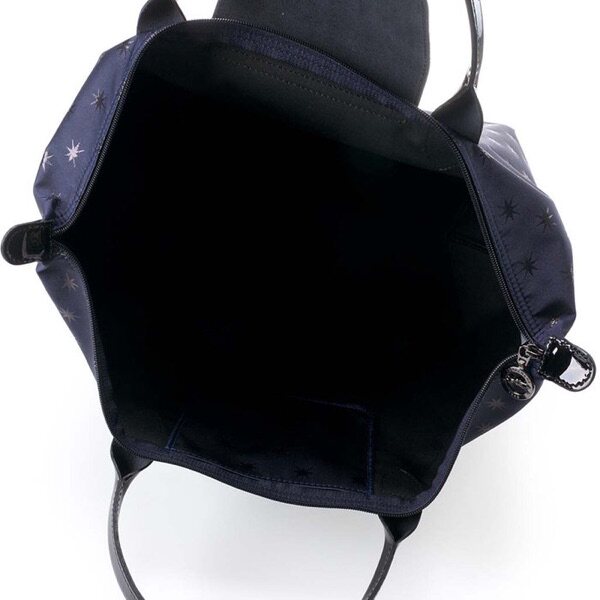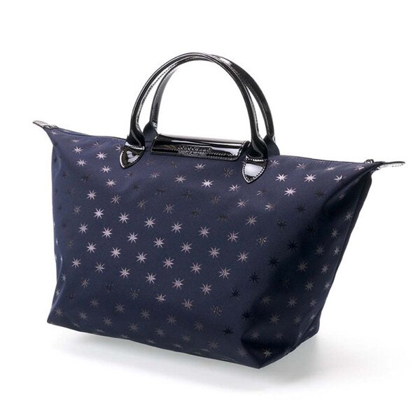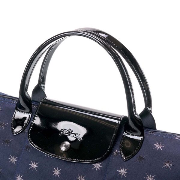 Longchamp drew its inspiration from origami when creating LE PLIAGE, a light, foldaway bag that has since become a cult object worldwide. This sparkling version of LE PLIAGE Etoiles created from a lightweight jacquard canvas is woven with stars and decorated with black patent leather.