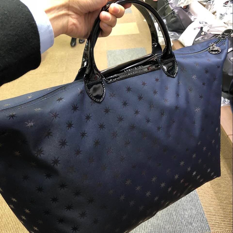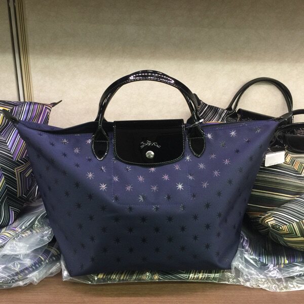 L*ngch*mp drew its inspiration from origami when creating LE PLIAGE, a light, foldaway bag that has since become a cult object worldwide. This sparkling version of LE PLIAGE Etoiles created from a lightweight jacquard canvas is woven with stars and decorated with black patent leather.
