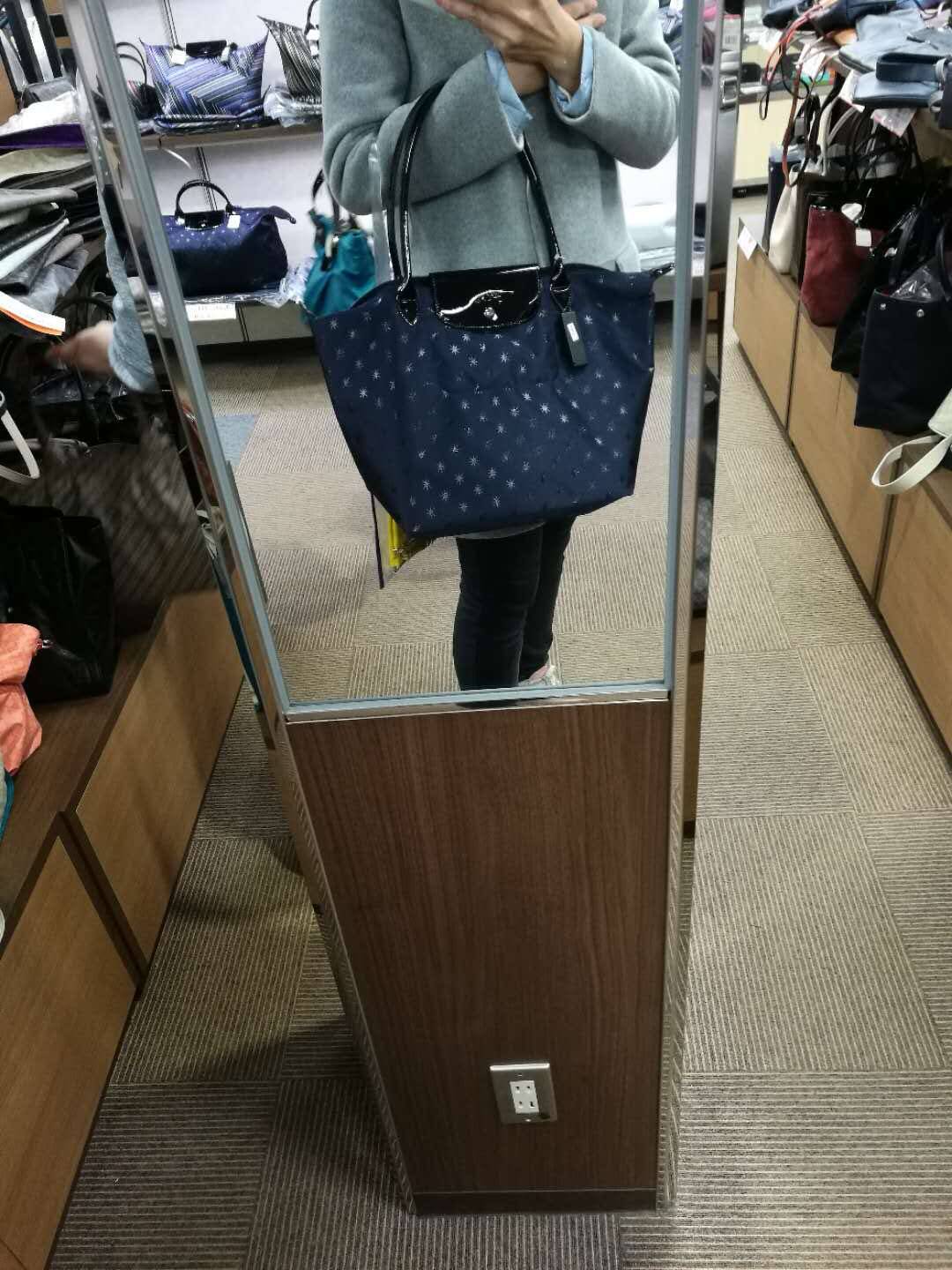 This model with streamlined handles and a leather, snap-fastening button flap is one of L*ngch*mp’s most emblematic bags.