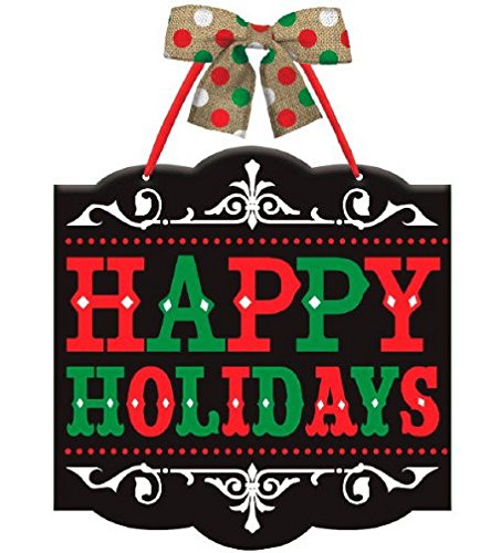Black Chalkboard Wooden Happy Holidays Wall / Door / Window Sign w/Burlap Bow & Ribbon Hanger