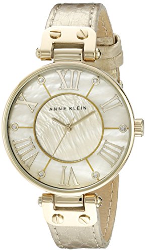 -. Binding : Watch -. Brand : Anne Klein -. Color : Gold -. Department : womens -. EAN : 0086702507085 -. Feature : Round gold-tone watch with 34.0 mm metal case and mineral dial window / Japanese quartz movement with analog display / Featuring gold-tone face, gold-tone Roman numeral markers, crystal indices, and reptile-embossed calfskin band with buckle closure / Water resistant to 99.0 feet (30 meters) -. IsAdultProduct : 0 -. Label : Anne Klein -. Manufacturer : Anne Klein -. Model : AK/1012GMGD -. MPN : AK/1012GMGD -. PackageQuantity : 1 -. PartNumber : AK/1012GMGD -. ProductGroup : Watch -. ProductTypeName : WATCH -. Publisher : Anne Klein -. ReleaseDate : 2012-07-15 -. Size : One Size -. Studio : Anne Klein -. Title : Anne Klein Women's AK/1012GMGD Leather Gold-Tone Snake P.R.Int Watch -. UPC : 086702507085