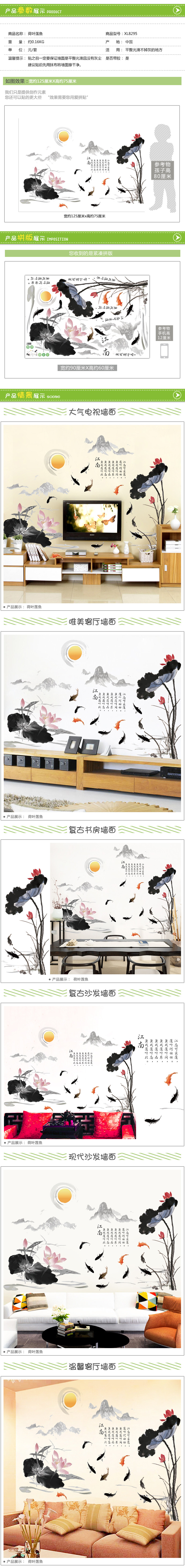 中国风荷花荷叶墙贴客厅电视墙背景装饰贴纸浴室贴防水可移除贴画