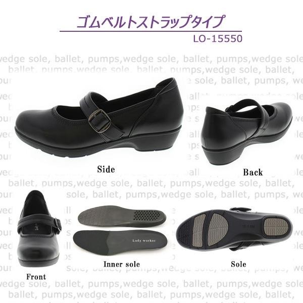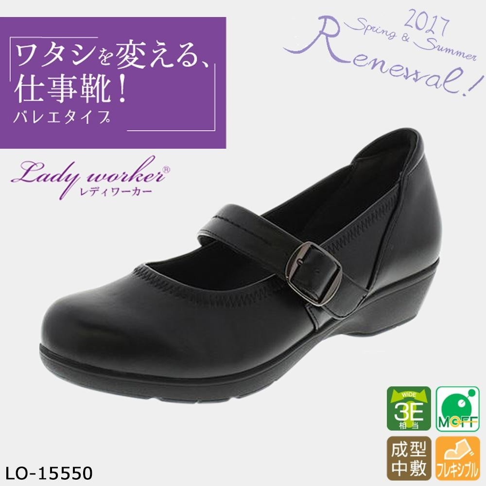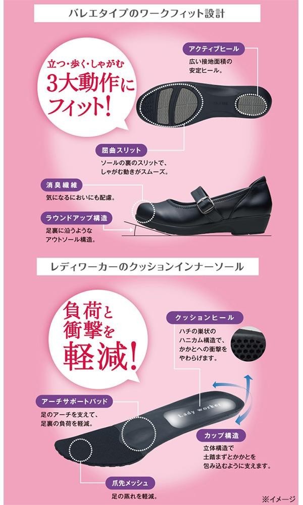 立ち仕事の女性のアンケート結果をもとに商品化したオフィスパンプスです。中敷にはクッションがあり、かかとは衝撃緩衝するハニカム構造を採用し、足への負担が少ない設計です。さらにプレーンの靴にありがちな、かかと抜けをベルトで防止しているので、動きやすい一足です。 |