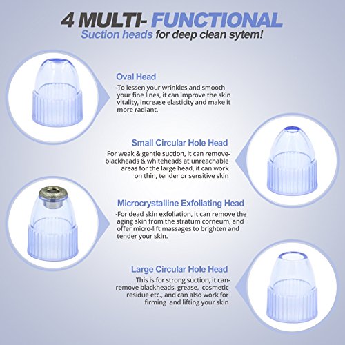 - ✅SAFE & EFFECTIVE - Our Blackhead Vacuum is made of eco-friendly material ABS & has an EFFECTIVE way of cleansing the pores without any chemicals, the unique design of the 4 heads help the skin & different parts of the face. It can remove oil, impurities and dirt in large clogged pores. Our cleansing tool can also increase blood circulation, improve skin elasticity, exfoliate dead skin, tighten up loose skin, lessen wrinkles, shrink pores, smooth your fine lines & make your skin more radiant.