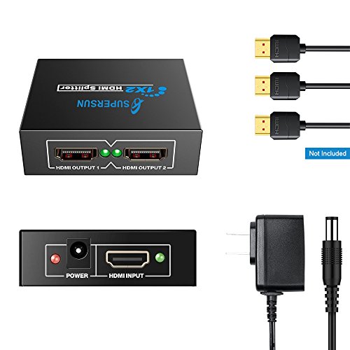 - Splitters TVs Outputs Ports - hdmi splitter's package contains hdmi 1 to 2 splitter box, AC power charger and user manual. SUPERSUN hdmi cable splitter offer 30 unconditional refund and 1 year worry free warranty with 24/ 7 top customer support.
