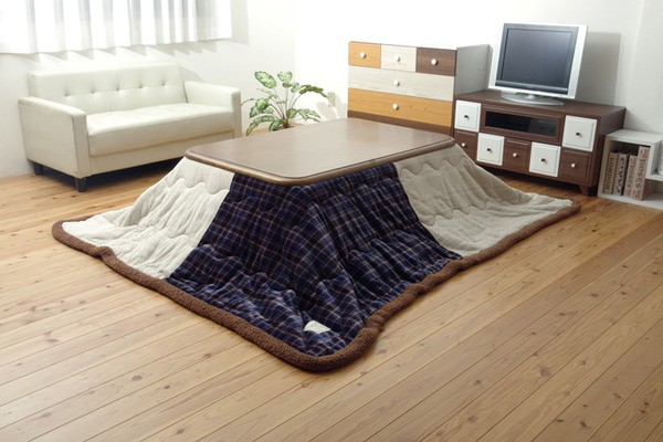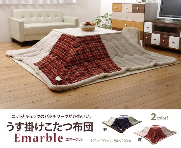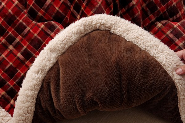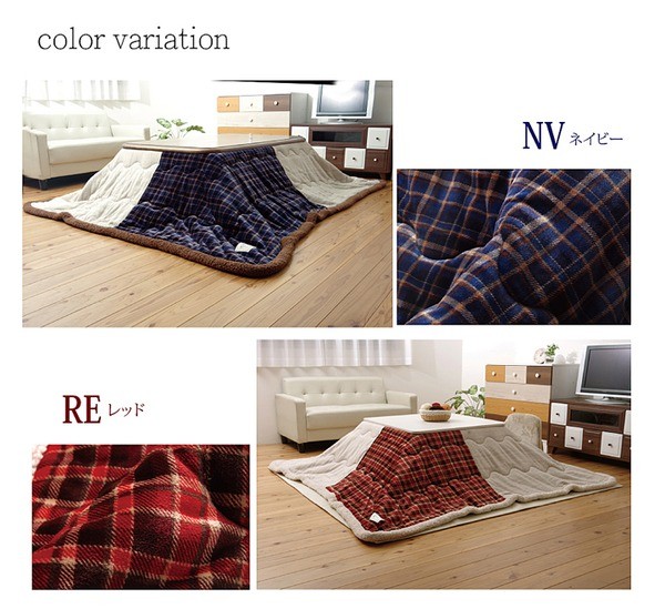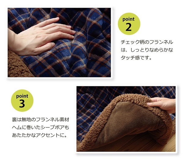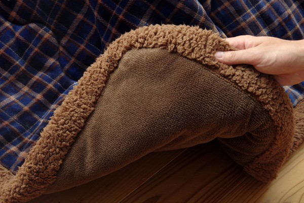 無地とチェックの生地を使用した、カジュアルであたたかみのあるこたつ布団です。裏地にはソフトな肌感触のフランネル生地を使用しています。薄手なのでかさばらず、コンパクトに収納できます。部分暖房のコタツは電気代もおトクです。