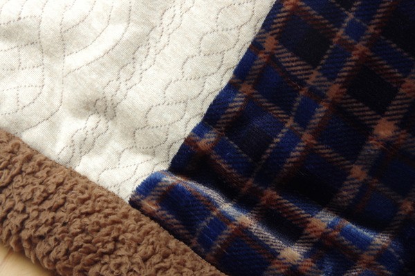 【素材】:表地=柄部)ポリエステル80% 綿20%【ジャガード】 無地部)ポリエステル100%【フランネル】 裏地=ポリエステル100%【フランネル】 中綿=ポリエステル100%