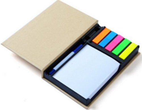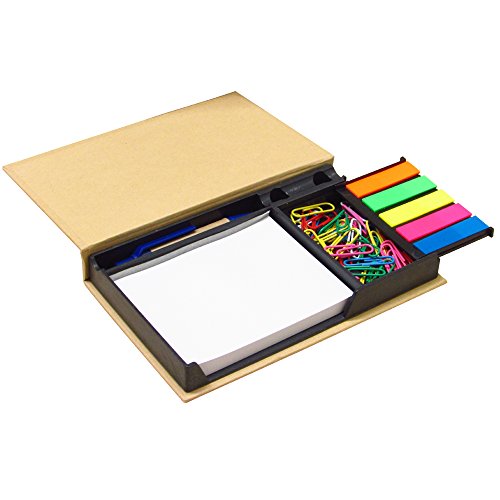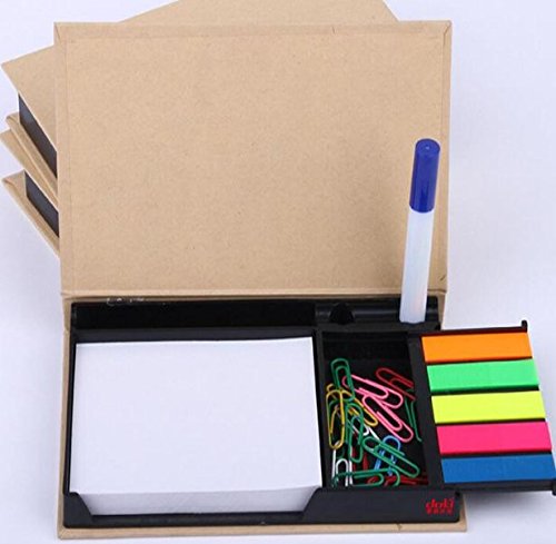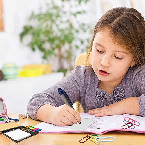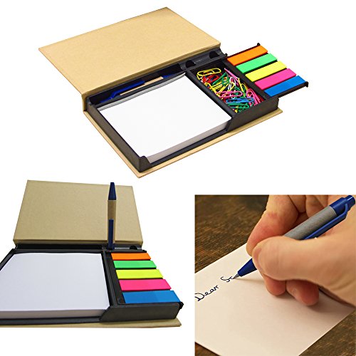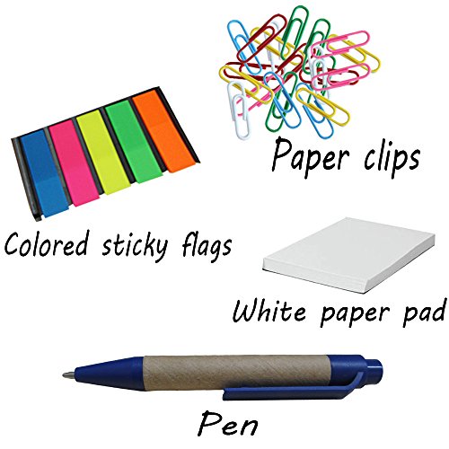 - COMBO KIT INCLUDES: White note pad 4" x 3" for jotting down important notes, 5 pads of sticky flags 1.75" long (orange, green, yellow, pink, and blue), 1 compartment for colorful paper clips- 28mm, mini blue ink pen- 3.5"