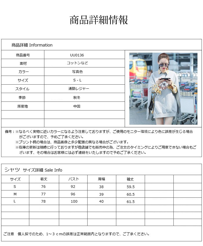 L:バスト100 着丈78 袖丈61.5 肩幅40