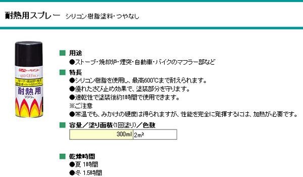 シリコン樹脂を使用し、最高600度まで耐えられます。ストーブ・焼却炉・煙突・自動車・バイクのマフラー部などにお使いいただけます。つやなし。
