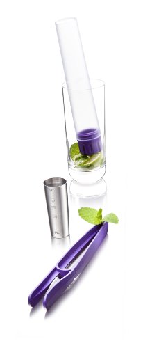 - Set includes muddler, tongs, and jigger