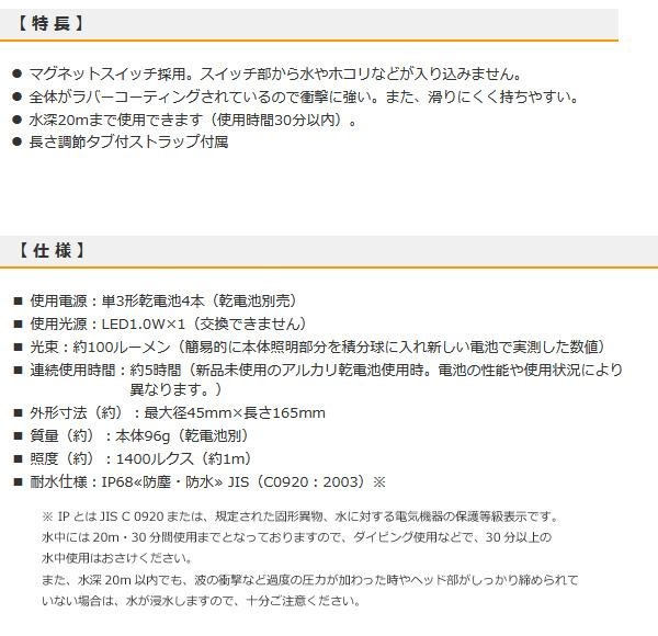 fk094igrjs全体がラバーコーティングされているので衝撃に強く、スイッチ部からの水やホコリの侵入を防ぎますサイズ個装サイズ:9×21×5cm重量個装重量:125g付属品ストラップ×1製造国中国水深20mまで使用可能な防水ラバーライト!!全体がラバーコーティングされているので衝撃に強く、スイッチ部からの水やホコリの侵入を防ぎます
