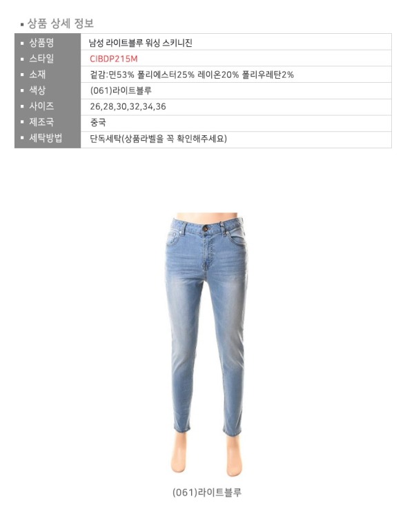 남성용 라이트 블루 스키니 진 입니다 26 사이즈와 36 사이즈 까지 나오기때문에 마르신 체형분들도 편하게 착용하실수 있습니다