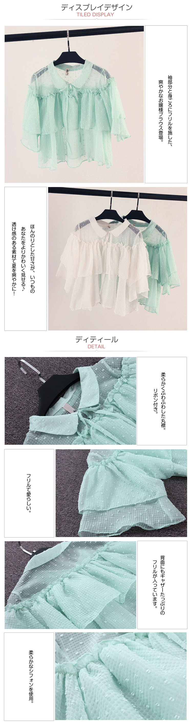| 袖部分と身ごろにフリルを施した、爽やかなお嬢様ブラウス登場。ほんのりとした甘さが、いつものあなたをよりかわいく見せる?透け感のある素材で夏を爽やかに! | |